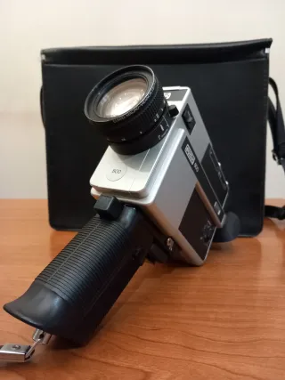 Cámara de vídeo analógica Eumig 800. - Cuerpo plateado y negro. - Empuñadura ergonómica.. - Lente Eumig Macro-Viennon 1.8/8-64.