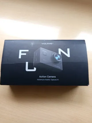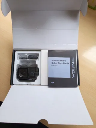Cámara de acción WOLFANG en color negro. grabación 4K, funda acústica, cable USB-C, micrófono, control remoto , Wifi, 2 bateias ,accesorios varios para montaje en manillar o casco - Utiliza una sola vez - vendo por no usar