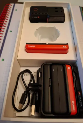 Cámara de acción Insta360 ONE R con módulo 4K. - Incluye módulo de lente 4K. - Cuerpo principal de la cámara. - 2 Baterías originales y una de competencia. - Cargador dual para dos baterías - Soporte para montar tipo GoPro - Cable de carga USB.