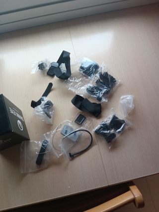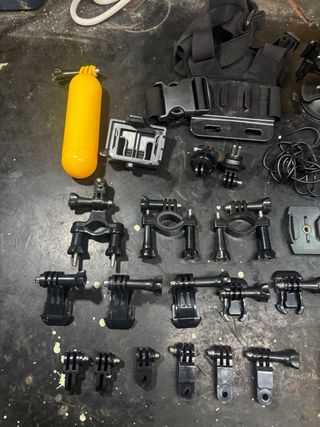 Lote de accesorios para cámaras de acción, incluyendo dos cámaras No son gopro - Dos cámaras de acción. - Flotador amarillo. - Soporte para casco. - Soporte para manillar. - Soporte de pecho. - Variedad de adaptadores y tornillos. - Carcasas transparentes nuevas de recanvio - Batería nueva de recanvio - Mandos a distancia. Las dos camaras funcionan perfectamente una con micro la otra sin -Dos carcasas una para algua otra para protejer mientras grabas incluye cargador de las camaras mas funda