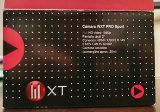 Cámara WXT Pro Sport nueva no usada, solo caja abierta. Con complementos. FULL HD video 1080p. Pantalla táctil. Conexión HDMI/USB 2.0/AV. 5MPx CMOS sensor. Carcasa acuática. Sumergible.