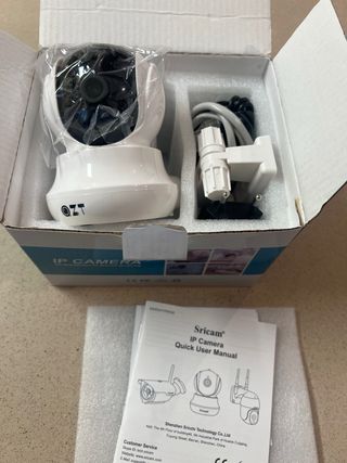 Cámara de vigilancia Sricam con conexión IP. Incluye todos los accesorios para su instalación. - Cámara IP. - Soporte de montaje. - Adaptador de corriente. - Cable USB. - Tacos y tornillos. En su caja original,sin usar