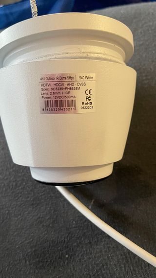 Cámara de seguridad tipo domo para exteriores. - Resolución de 5MP. - Visión nocturna IR. - Soporta HDTVI, HDCVI, AHD, CVBS. - Lente de 2.8mm. - Alimentación 12VDC/500mA.