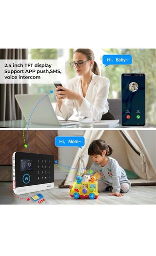 Sistema de alarma PGST con conectividad GSM y WiFi. - Panel de control con pantalla táctil y teclado numérico. - Incluye sensor de movimiento, sensor de puerta/ventana, dos mandos a distancia y dos llaveros RFID. - Sirena externa incluida.