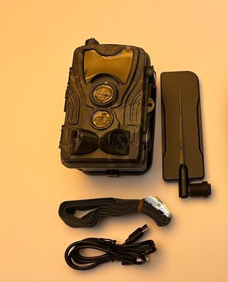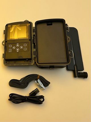Cámara de trampeo con diseño camuflado, ideal para exteriores. Incluye accesorios para su uso y transporte. - Cámara de trampeo con lente. - Antena externa. - Correa de sujeción. - Cable de carga USB. - IP 65 de protección. - Tiene también App para su manejo con SIM 4G. - Detección de movimientos. - Bahía para memoria SD de 256 Gb. - Vídeo 4K. H 265. - 36 MP. IR. - Carcasa mimetizada.