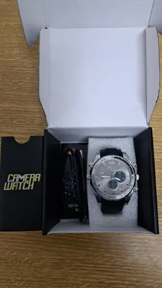 Reloj de pulsera con función de cámara oculta. Incluye accesorios para su carga y manual. - Diseño discreto y elegante. - Correa negra ajustable. - Esfera plateada con detalles.