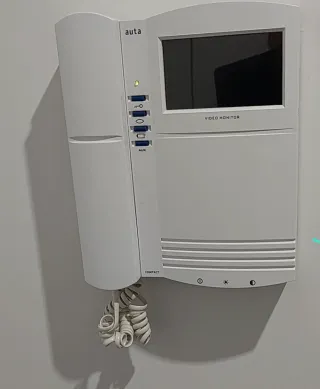 Telefonillo para videoportero de la marca AUTA. Diseñado para ser montado en pared. - Pantalla de monitor de vídeo. - Botones de función y luz indicadora.