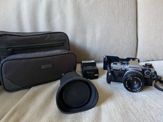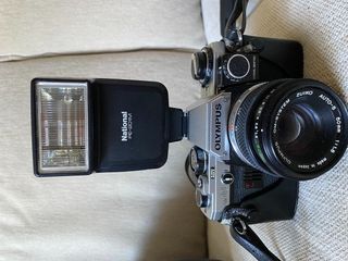 Olympus OM10, modelo de cámara reflex lanzado por Olympus Corporation en junio de 1979. Lente Zuiko f 1,8 y 50mm y lente soligor f 35 - 200mm. Incorpora flash multisistema National PE-201M. La cámara viene con protector y bolsa de viaje incluida. Excelente estado.