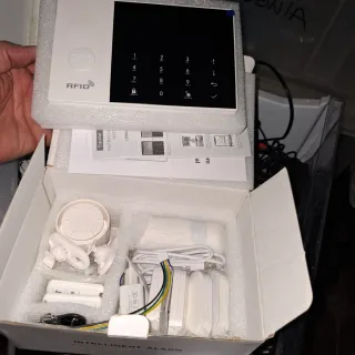 Sistema de alarma de seguridad inteligente con pantalla táctil y función RFID. Incluye botón SOS. - Panel de control con pantalla. - Lector RFID integrado. - Botón de emergencia SOS.