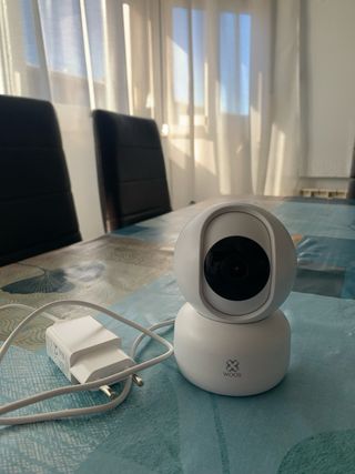 Cámara de vigilancia para casas o locales inteligente con movimiento PTZ. Modelo r4040. Está nueva. - Diseño moderno en color blanco. - Logo de la marca visible en la base. -Imagen HD -Controla tu casa mediante su aplicación WOOX y verás de noche y de día. -Desde la aplicación podrás mover el objetivo para ver en detalle todo lo que suceda.