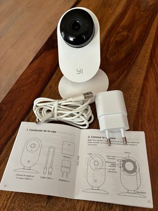 Cámara de vigilancia YI Home 1080P. - Incluye cámara, cable USB y adaptador de corriente. - Manual de usuario incluido.