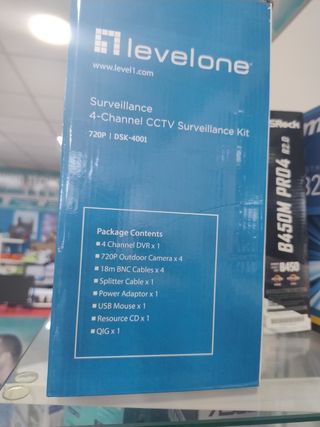 Kit de vigilancia LevelOne DSK-4001 en buen estado. Incluye 4 cámaras para exteriores, un DVR de 4 canales, cables BNC (18m cada uno), un divisor, un adaptador de corriente, un ratón USB y un CD de recursos. El equipo está prácticamente nuevo. - 4 cámaras exteriores - DVR de 4 canales 720p - Cables BNC (4 x 18m) - Divisor - Adaptador de corriente - Ratón USB - CD de recursos