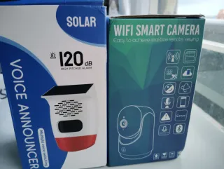 Pack de alarma solar y cámara de seguridad WiFi. - Alarma solar de 120 dB de alto tono. - Cámara WiFi inteligente con visualización remota en tiempo real. - Múltiples opciones de cambio de voz para la alarma.