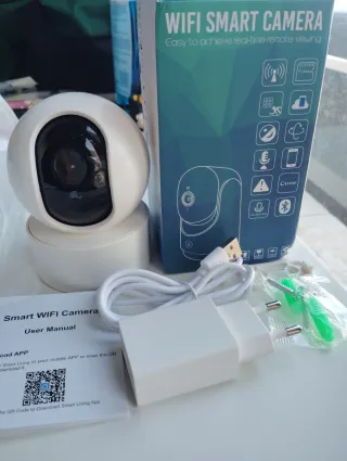 Cámara de vigilancia inteligente con conexión WiFi. Ideal para monitoreo del hogar. - Diseño compacto y moderno. - Antena para mejor recepción de señal. - Incluye cable de conexión y accesorios de montaje.