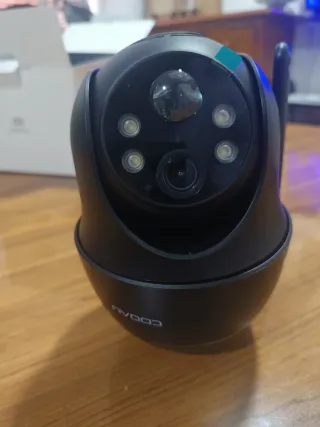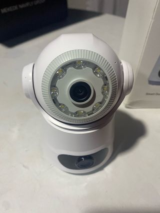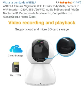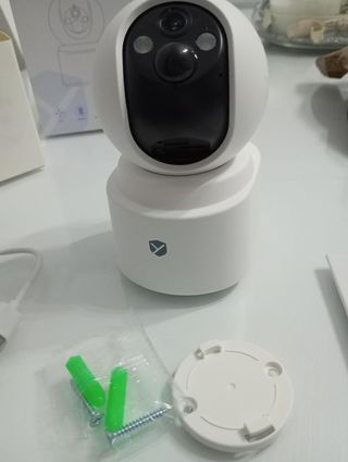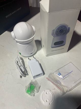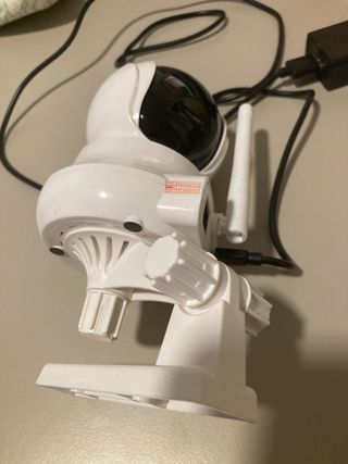 Cámara WiFi con resolución 1080p, visión nocturna por infrarrojos y rotación 360° desde la app. Detección de movimiento con seguimiento automático y avisos al móvil. Audio bidireccional (escucha y habla). Compatible con WiFi 2,4 GHz o cable Ethernet. Grabación en microSD (no incluida) o en la nube. En perfecto funcionamiento y con poco uso.