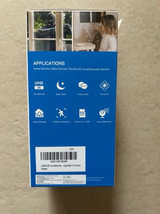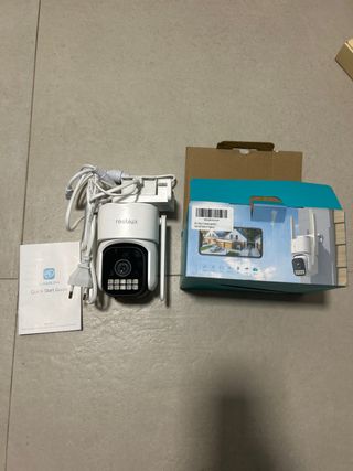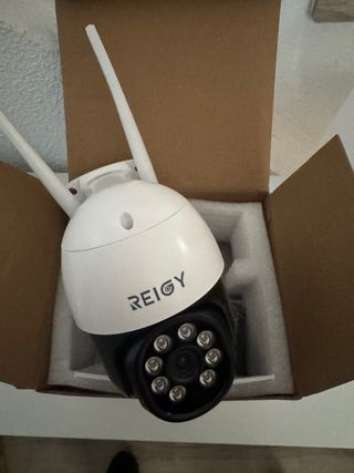 Cámara de vigilancia Reobiux WiFi para exterior, con dos lentes. ¡Ideal para mejorar la seguridad de tu hogar! - Resolución 2K/6MP. - Visión nocturna. - Control PTZ (Pan, Tilt, Zoom). - Doble lente para mayor cobertura. - Incluye soporte para montaje en pared. - Totalmente sin estrenar en su caja.
