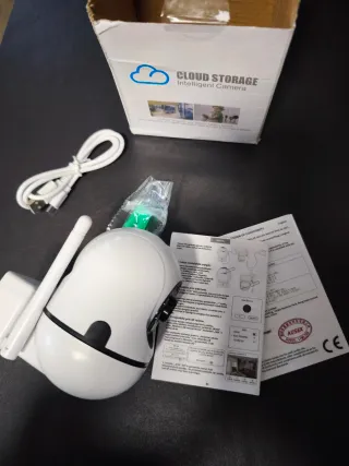 Cámara de vigilancia HD inteligente con almacenamiento en la nube, apta para uso en interiores y exteriores. - Sin estrenar, con todos los accesorios y embalaje original.. - Uso interior/exterior. - Detección de movimiento. - visión nocturna. - Micrófono y altavoz - Graba y se ve en directo desde el teléfono. - direccionable 365°.