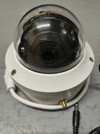 Cámara de seguridad tipo domo con lente y luces infrarrojas. - Diseño compacto y discreto. - Carcasa resistente. - Conexiones para video y alimentación.