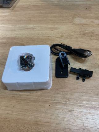 Cámara espía compacta, ideal para tu coche. Incluye todos los accesorios necesarios para su uso. - Cámara principal negra. - Caja original. - Cable USB. - Adaptador de corriente.