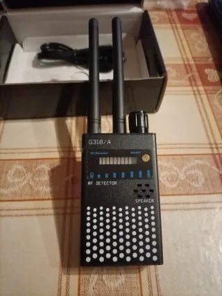 Detector de RF G318/A para encontrar cámaras ocultas y otros dispositivos. - Diseño compacto y portátil. - Pantalla LED para indicar la intensidad de la señal. - Antenas para una mejor recepción. - Altavoz integrado para alertas sonoras.