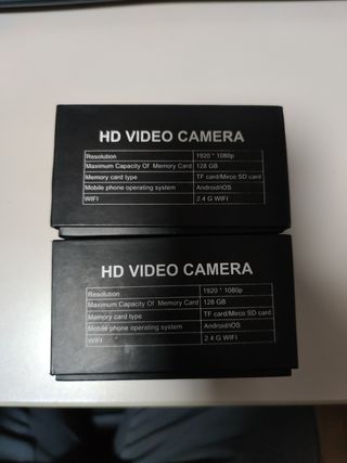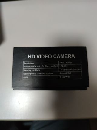 Cámara en perfecto estado (abierta pero sin usar), con caja, cables, etc. Graba audio y video a 1080p, tiene detector de movimiento, almacena en SD ... Cuenta con bateria y ranura de SD. Graba con luz normal y tiene luz infrarroja también para grabar en conditde oscuridad. Es MUY pequeña, no llega a 30x30 milímetros.