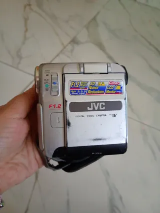 Videocámara JVC Mini DV en tonos plata y negro. Incluye accesorios para su uso. Vendo cámara JVC Mini DV antigua en perfectas condiciones, funcionando perfectamente, con todos sus componentes. La batería no funciona, pero puede comprarse online (hay que buscarla). Pero funciona enchufada a la corriente. La calidad es fenomenal, incluye mando a distancia, funcionan perfectamente todos sus mecanismos e incluye todos sus cables, más un cassette de regalo para grabar y un estuche para llevarla contigo. - Mando a distancia. - Cargador de corriente. - Cables de conexión AV. - Correa de mano. - Bolsa de transporte.