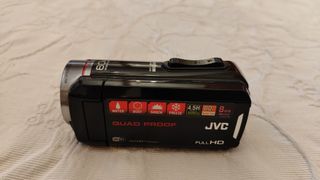 Se vende cámara de vídeo compacta JVC Quad Proof modelo GZ-RX115BE. Cámara resistente al agua, al polvo y a las bajas temperaturas, con memoria interna de 8 gb, batería con una duración de 4,5 horas, tecnología FullHd y zoom dinámico de 60x. Está provista de todos sus accesorios que incluye: Libro de instrucciones, cargador con sus cables, cable de conexión al ordenador USB, cable AV de conexión a la televisión, filtros y funda Lowepro. Se encuentra en perfectas condiciones de funcionamiento y conservación. Entrega en mano y pago en efectivo. Zona Acacias-Pirámides (Madrid).
