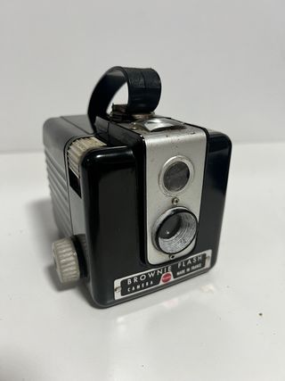 Cámara fotográfica vintage Kodak Brownie Flash. - Diseño clásico en color negro y plateado. - Incluye asa de transporte superior.