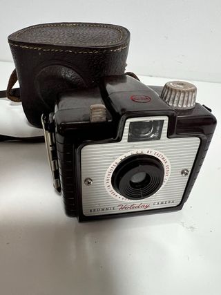 Cámara fotográfica Kodak Brownie Holiday en color marrón y plateado. Incluye su funda de cuero. - Diseño clásico. - Ideal para coleccionistas. 30