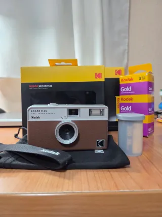 Cámara analógica Kodak Ektar H35 en perfecto estado, ideal para fotografía con película de medio formato que permite multiplicar por 2 el número de fotografías de cada carrete. Incluye un carrete o película fotográfica Gold 200 ISO 36 exp (permite sacar 36x2 fotografías). - Diseño compacto y ligero. - Acabado en marrón y plateado. - Como nueva, únicamente con 1 carrete usado.