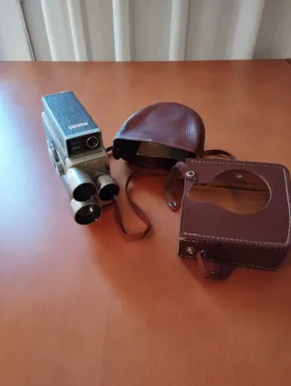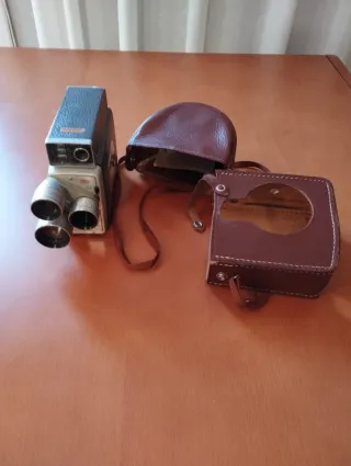 cámara de cine Kodak Brownie 8 MM Movie Camera II. Esta cámara de época, popular entre los aficionados a mediados del siglo XX, presenta las siguientes características: Fue fabricada por Kodak entre marzo de 1960 y septiembre de 1962. Utiliza película de doble 8 mm. Cuenta con un objetivo Cine-Kodak Ektanon de 13 mm f/2.3 de enfoque fijo. Funciona con un mecanismo de relojería de cuerda y no requiere baterías. La exposición se ajusta mediante un dial alrededor del objetivo, con símbolos para diferentes condiciones de luz (sol brillante, sol velado, sombra, etc.) vintage retro atrezzo coleccionista fotografo tripode analogica