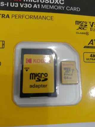Tarjeta de memoria microSDXC de 64GB de la marca Kodak. - Capacidad: 64GB - Clase de velocidad: UHS-I U3 V30 A1 - Ideal para smartphones, cámaras y drones.