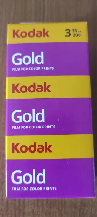 Pack de tres películas Kodak Gold 200. Cada película es de 35mm y tiene 36 exposiciones. - Película para color. - ISO 200. Fecha de caducidad: 09/2027