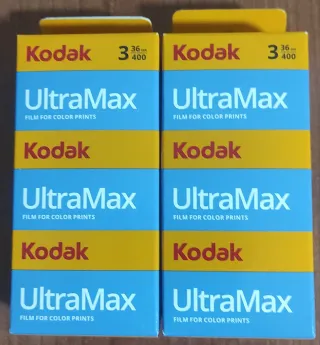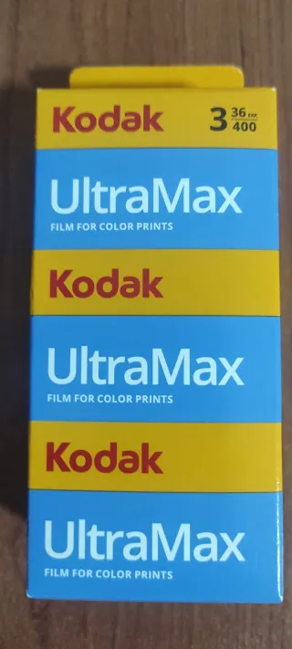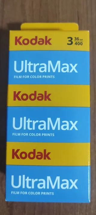 Pack de 3 carretes de película fotográfica Kodak UltraMax 400. - Formato 135. - 36 exposiciones por carrete. - Ideal para fotografía de color. Fecha de caducidad: 08/2027