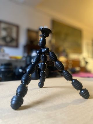 Trípode flexible Kodak Essentials, ideal para cámaras y smartphones. Su diseño permite adaptarlo a diversas superficies. - Patas articuladas para máxima versatilidad. - Cabezal giratorio para ajustar el ángulo. - Compacto y ligero para llevar a cualquier parte. - Nunca usado
