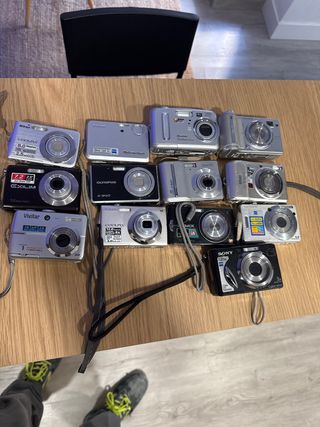 Lote de cámaras digitales de varias marcas, ideal para quienes buscan piezas o desean repararlas. Cada cámara presenta un diseño compacto y portátil. - Incluye modelos de Nikon, Kodak, Sony, Olympus, Vivitar y Casio. - Variedad de colores plateados y negros.