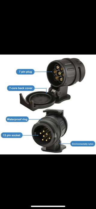 Adecuado para remolque estándar europeo. Suministra energia a su caravana, remolque y camión. Convierte el enchufe de 13 Pines de su automóvil en el enchufe hembra de 7 pines. Establece una conexión segura entre su vehículo principal y el remolque adicional; Transfiere las luces de señal electrónica del vehículo al remolque. La solapa de bloqueo con resortes a prueba de intemperie protege las conexiones cuando no se usan y se bloquea en el enchufe de 7 pines cuando se usa