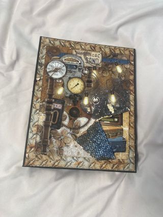 Álbum de fotos con un diseño único inspirado en herramientas y elementos industriales. - Medidas: 15x20 sm aproximadamente. - Cubierta con textura de metal y detalles de engranajes. - Motivos de tuberías, medidores y bombillas. - Acabado rústico y vintage.