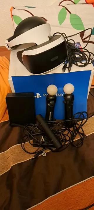 Se vende casco de realidad virtual PlayStation VR junto con dos mandos Move. - Casco VR en blanco y negro. - Dos mandos Move negros. - Cables de conexión incluidos. - Camara. ¡Vende un paquete completo de realidad virtual! Las gafas PlayStation VR están prácticamente nuevas, sin rasguños y con un rendimiento impecable. Incluye los dos mandos PlayStation Move, con las bolas luminosas funcionando perfectamente. ¡Ideal para disfrutar de una experiencia inmersiva y juegos de realidad virtual!