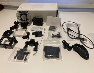 Cámara de acción 4K con micrófono, impermeable con funda subacuática resistente hasta 40 metros, incluyendo múltiples accesorios sin usar, como agarres para moto, coche, etc Viene con el cable para cargar y una batería extra de repuesto, con la caja y manual de instrucciones tal cual se ve en las fotos. Apenas sin utilizar aún conserva el film transparente de la pantalla trasera, sin ningún rasguño.