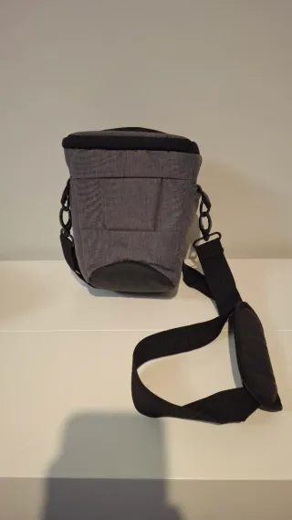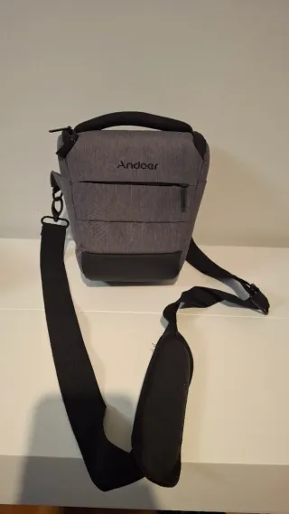 Funda para cámara fotográfica de la marca Andoer. Es de color gris y tiene un diseño moderno. - Material textil resistente. - Correa ajustable para colgar. - Compartimento principal con cierre.