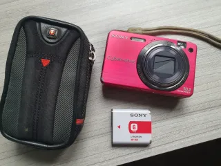 Cámara digital compacta Sony Cyber-shot en color rosa. Batería NP-BG1. - Lente Carl Zeiss Vario-Tessar. - Sensor de 10.1 Megapíxeles. - Tarjeta memory stick pro duo 4 GB - Cargador de batería - Signos de desgaste La funda va de regalo, tiene la cremallera rota, no se puede cerrar
