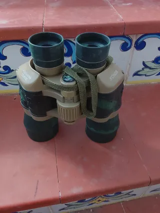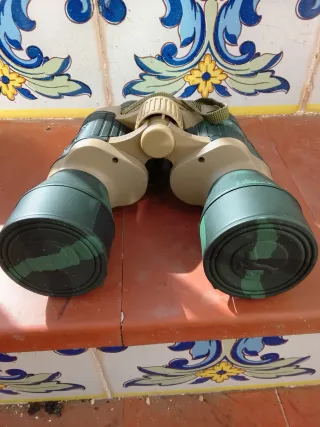 Prismáticos con diseño de camuflaje, ideales para actividades al aire libre. - Cuerpo principal en color beige. - Lentes con recubrimiento verde y negro de camuflaje.
