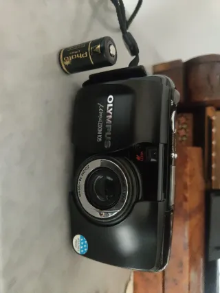 Cámara analógica Olympus mju Zoom 105 en color negro. Un clásico para los amantes de la fotografía. - Objetivo zoom 38-105mm. - Flash integrado. - Lente multifocal AF.