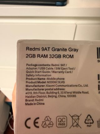 Teléfono móvil Xiaomi Redmi 9AT en color gris. Cuenta con una capacidad de almacenamiento interno de 32GB. - 2GB de memoria RAM. - Pantalla con notch. - Cámara trasera dual. Nuevo, sin abrir, con precinto.