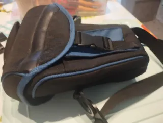 Funda protectora para cámara de fotos. - Color negro con detalles en azul. - Cierre de clip. - Correa ajustable.