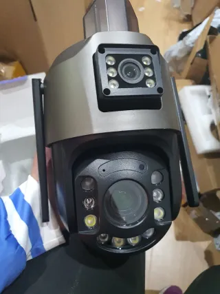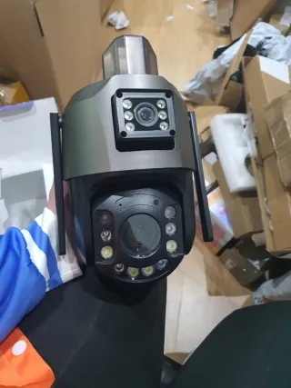 Cámara de seguridad con diseño moderno y funcional. - Cámara PTZ (Pan-Tilt-Zoom). - Antenas para conectividad. - Múltiples luces LED para visión nocturna.