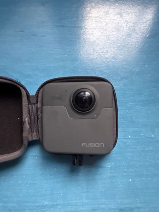 Cámara de acción GoPro Fusion en color gris, lista para capturar tus aventuras. - Diseño compacto y robusto. - Incluye funda protectora.