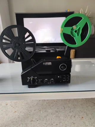 Proyector de Super 8 con carretes,cámara de grabación y flash - Modelo SOUND-501. - Incluye carrete negro y carrete verde. - Botones de control en la parte frontal.
