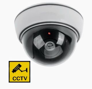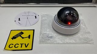 Cámara Vigilancia de imitación con diseño tipo domo, ideal para disuadir. - Acabado blanco y negro. - Luz LED roja parpadeante.
